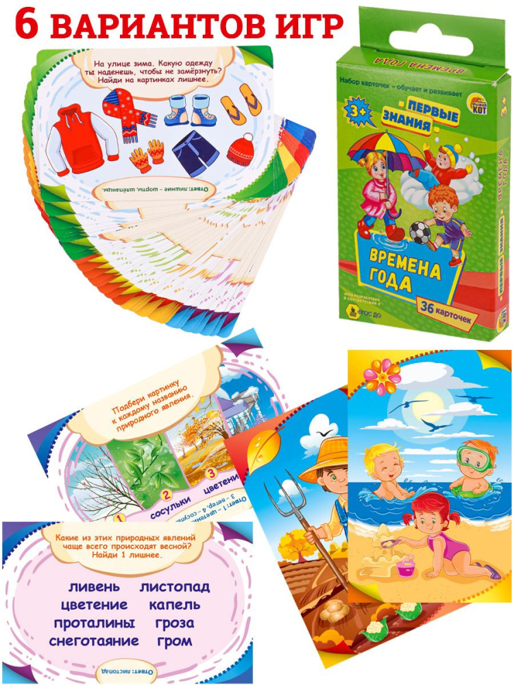 Перед Вами развивающая игра "Первые знания. Времена года" с особенным комплексом занятий, которая поможет детям получить знания и первичные представления об окружающем мире. Игра направлена на познавательное развитие личности ребенка. В ней дети не только узнают новое, но и учатся общаться. Игра может использоваться родителями как домашний развивающий материал, а также будет полезна в образовательных областях ФГОС, на групповых занятиях в детских садах и студиях развития. Подпишитесь на новости и акции: