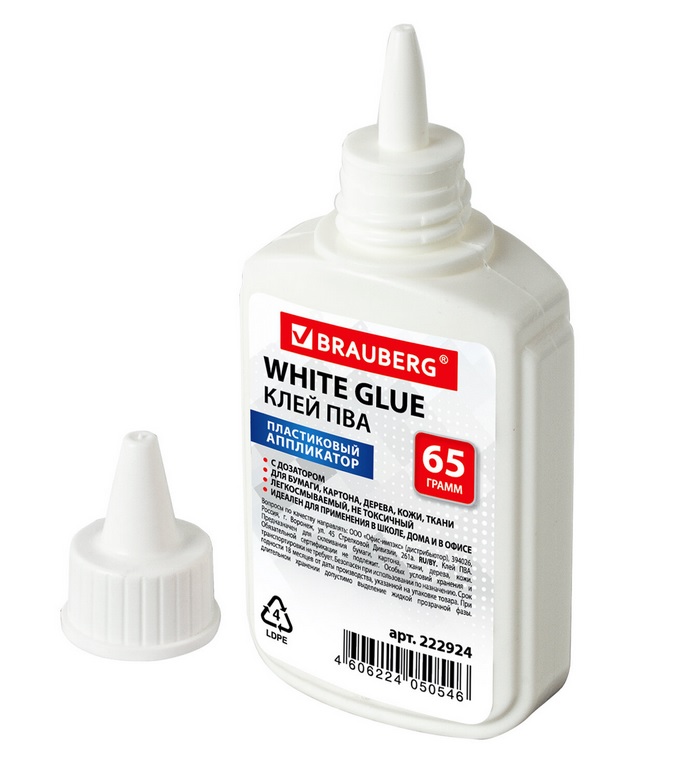 Клей ПВА BRAUBERG предназначен для склеивания бумаги, картона, фотографий, дерева и кожи.Имеет объем 65 мл. Пластиковый дозатор обеспечивает точное и равномерное нанесение. Обладает устойчивостью к морозу, не токсичен. Наносится тонким слоем, обеспечивая быстрое схватывание поверхностей, а также экономичное расходование. Съемный колпачок предохраняет клей от засыхания. Необходимо взболтать перед применением.